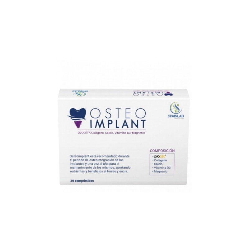 Osteoimplant® es un complemento alimenticio especialmente diseñado para proporcionar apoyo durante el proceso de osteointegración de los implantes dentales, así como para fortalecer y mantener la estructura de los dientes y encías. Esta fórmula avanzada contiene ingredientes clave como OVOCET®, colágeno porcino PROTEOSOL, calcio, vitamina D y magnesio, todos ellos esenciales para la regeneración y mantenimiento de los tejidos óseos y periodontales.